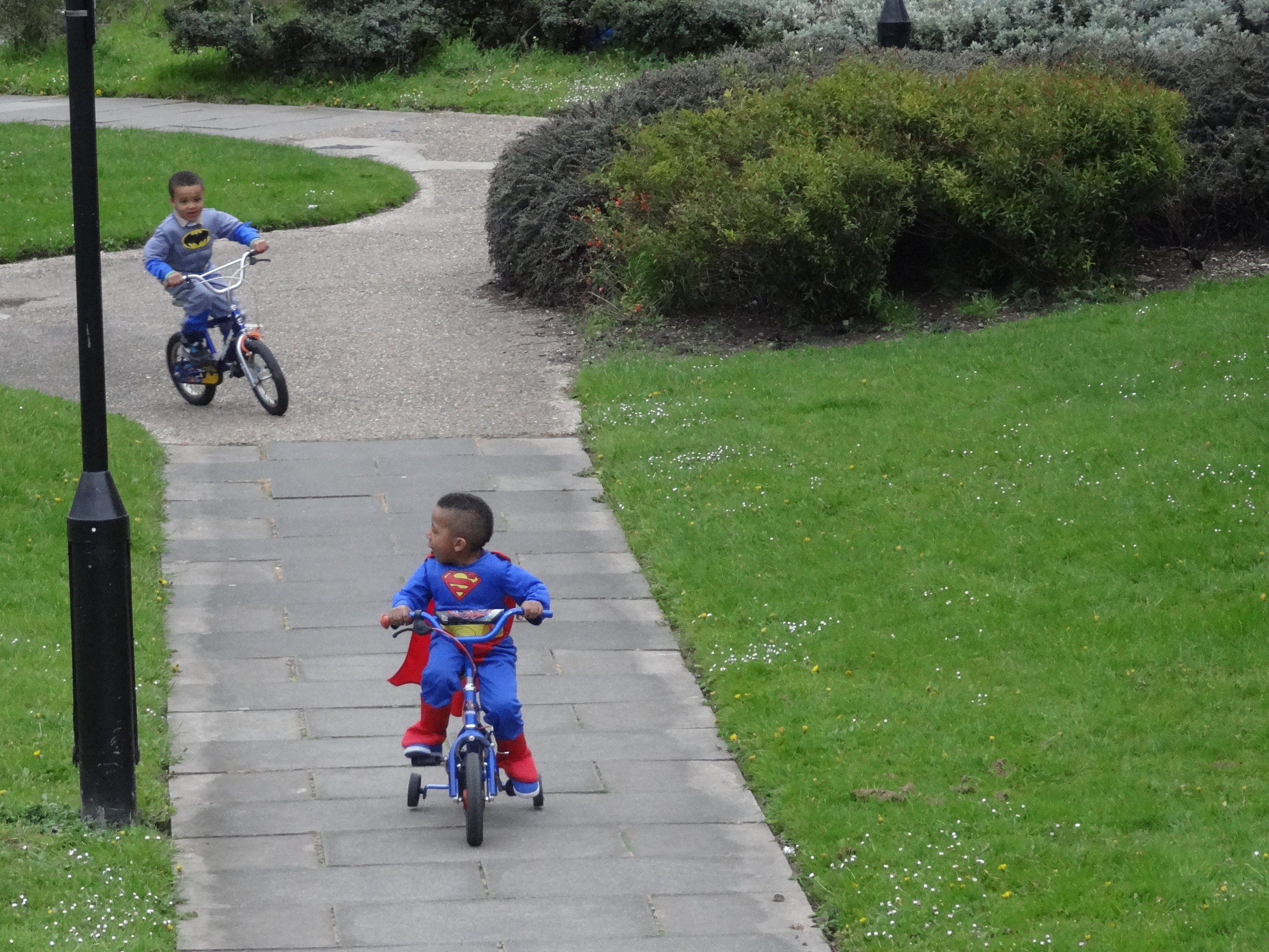 Tahtsin siia panna ka endale mälestuseks tehtud foto hollandi prouast hollandi jalgrattal, aga kui, rattalukk näpus (sest igaüks, kes on Krabatit lugenud, teab ju, et looma müües tuleb ohelik endale jätta), koju jalutasin, nägin, kuidas mu omaenda koduhoovis Superman ja Batman jalgratastel võidu sõitsid, ja see kaader võitis.