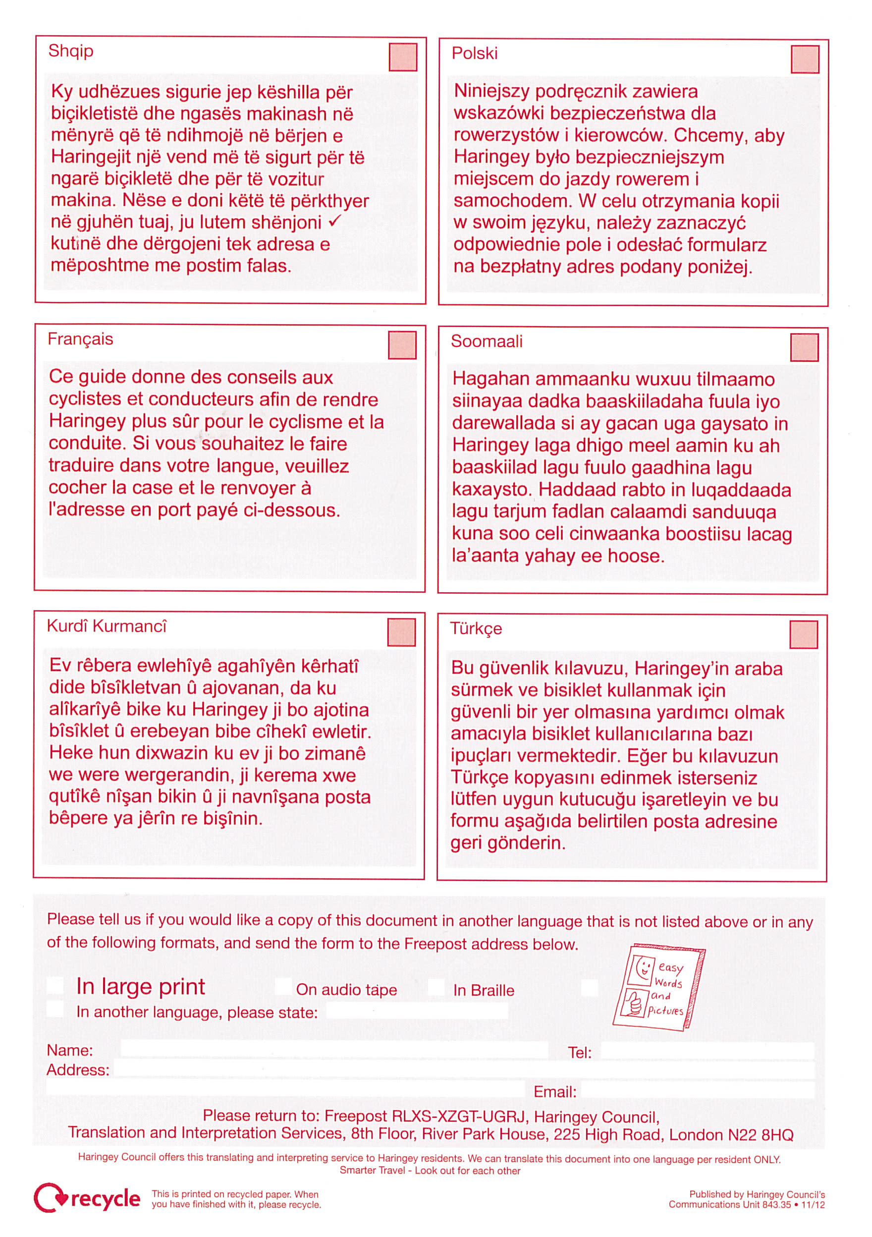 Täies teadmatuses sellest, et mul ei ole ikka veel ei jalgratast, autot ega isegi mootorratast, postitas linnaosavalitsus mulle hiljuti infomaterjali selle kohta, kuidas liikluses käituda. Kaks lehekülge nõuandeid autojuhile, kuidas jalgratturi vastu kena olla; lehekülg (ja veel natuke) nõuandeid jalgratturile, kuidas ellu jääda; ja minu lemmikosa, selgitus kuues levinumas kohalikus keeles, kuidas endale sellest voldikust tõlge tellida (NB! restrictions apply: We can translate this document into one language per resident ONLY.)