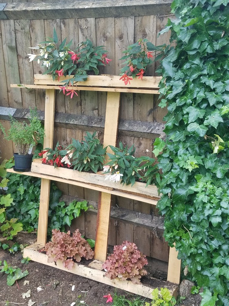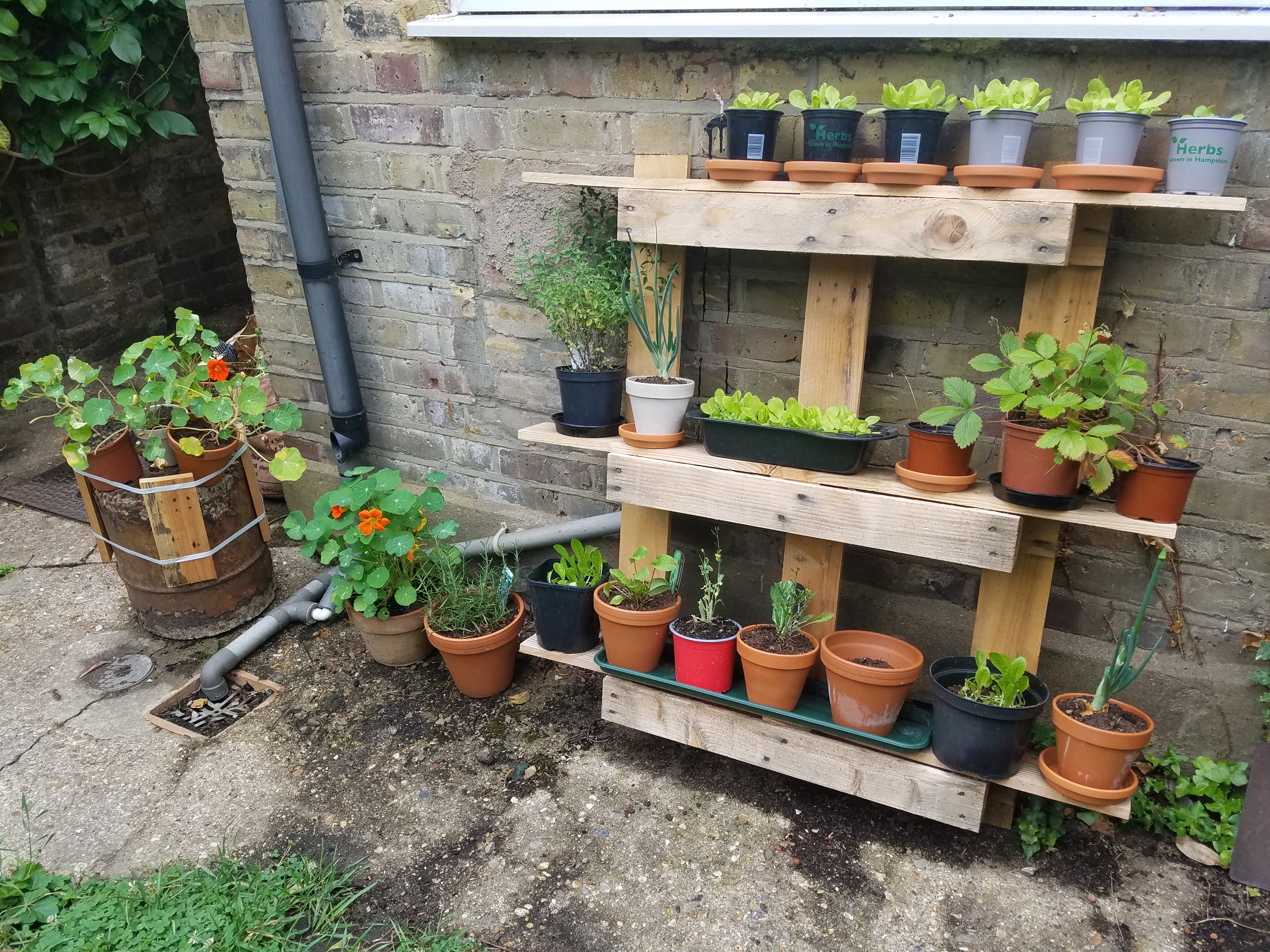 teine alus oli teistsuguse kujuga ja sellest ehitasin (ise! üksi! omaenda väikeste valgete kätega!) sellise riiuli, kuhu oli hea juba olemasolevaid potitaimi laduda, et nad rebastele jalgu ei jääks. kasutatud tööriistad ja materjal kahe riiuli jaoks kokku: haamer (lammutamiseks), kruvikeeraja, 15 kruvi. sest naelu meil polnud ja ehituspoed olid ju ka kinni.