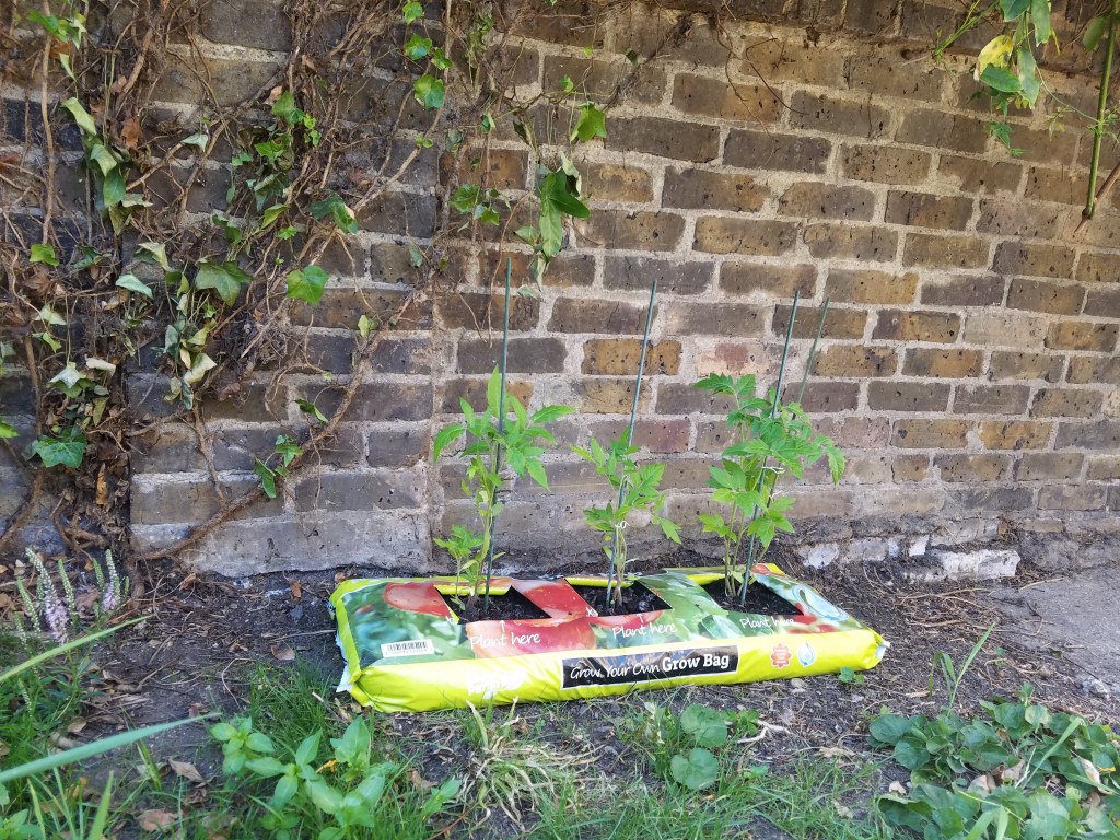 õnneks olid selleks ajaks aianduspoed lahti tehtud ja õnneks leidsin internetist vihje sellise toote kohta nagu grow bag. mis on lihtsalt üks kilekotitäis mulda, kuhu lõikad augud sisse ja siis istutad oma taimed aukudesse ja siis see ongi su peenar, paiguta, kuhu tahad ja sobib. (paigutada muidugi tasub enne istutamist, kasvavad taimed vaevalt et hilisemat ringilohistamist hindavad.) ma panin oma tomatikoti ühte päikselisemasse aiaserva heki alla, lootuses, et siis ei saja vihm väga kõvasti peale.