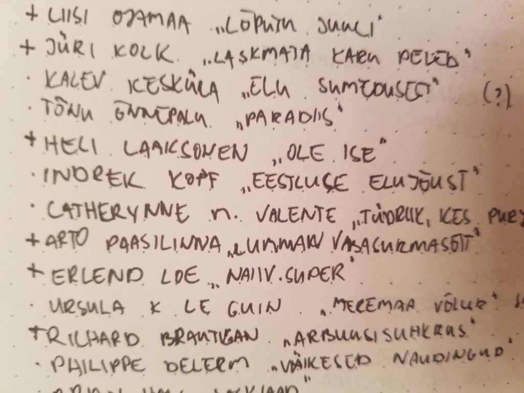 - boonusträkk: Robert Kurvitz, “Püha ja õudne lõhn” (boonus spst, et lugemise järel panin talle hindeks kolm tärni viiest ja halasin nädal aega kõigile, kuidas ma ei saanud üldse aru. aga kuu aega hiljem pole see raamat mind ikka veel lahti lasknud ja nüüd ma arvan, et kõik võiksid seda lugeda ja sellest võiks saada eesti kirjanduse tüvitekst, millest kirjutada lõputult kirjandeid, teha filme ja toota meeme.)