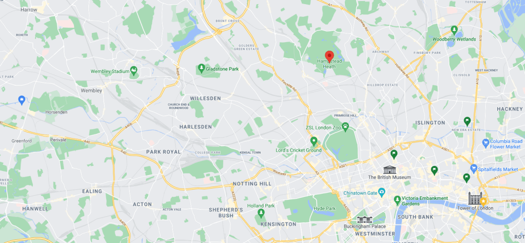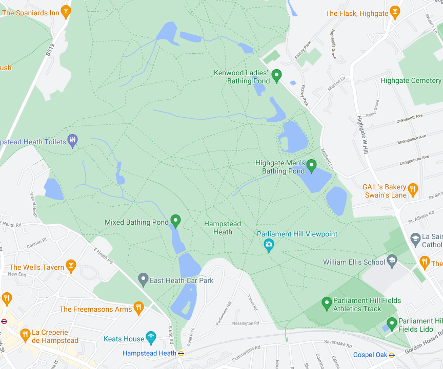 aastatega olen selgeks saanud, et Hampstead Heathi tiikidest paremaid ujumiskohti siin Londonis ikkagi eriti ei leia. õnneks HH jääb nüüd täpselt töö ja kodu vahele. siin teile üks illustreeriv kaart – sellel zoomitasemel kaotab Maps mu kodu tähistuse ära (ja polegi teil vaja nii täpselt teada), aga ma elan paremas servas, umbes seal, kuhu on West Hackney kirjutatud; tööl käin vasakus servas vastava tingmärgi juures ja Heathi märkisin punase täpiga ära.