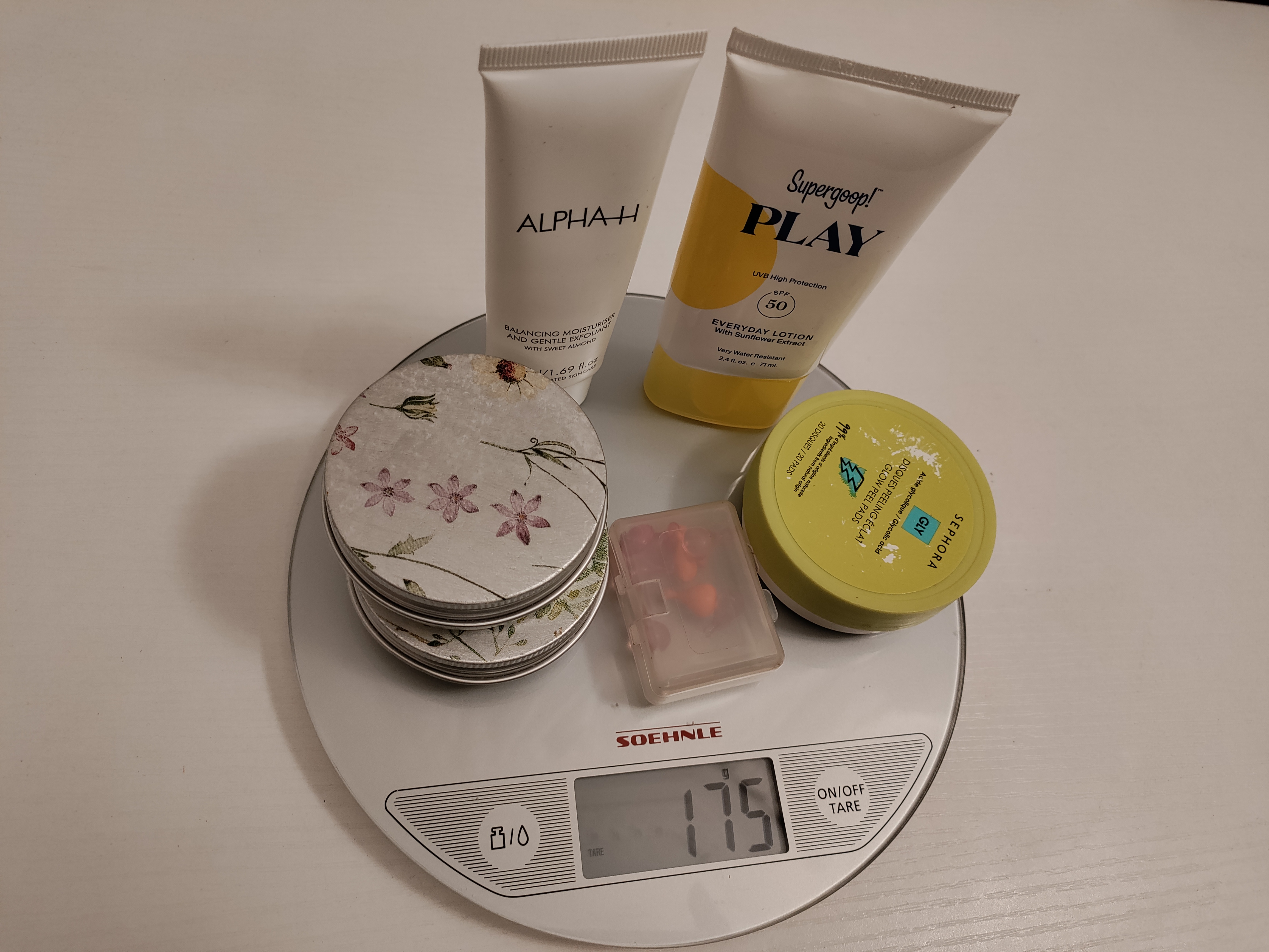 päiksekreemid: üks näole mõeldu on alati kodus ja üks (matka)kotis kaasas ja aegajalt ma kaalun neid mõlemaid käes ja kui kodune on tühjemaks ja kergemaks muutunud (ta pikapeale ikka muutub, sest saab rohkem kasutust), siis vahetan ära. sama teen muide deodorandiga – kodus on üks täiem ja kaasas täpselt samasugune, aga tühjem pudel, ja kui viimane päris tühjaks saab, siis ostan koju uue ja hakkan vana poolikut kaasas kandma, kokkuhoid mitukümmend grammi. lifehack missugune.