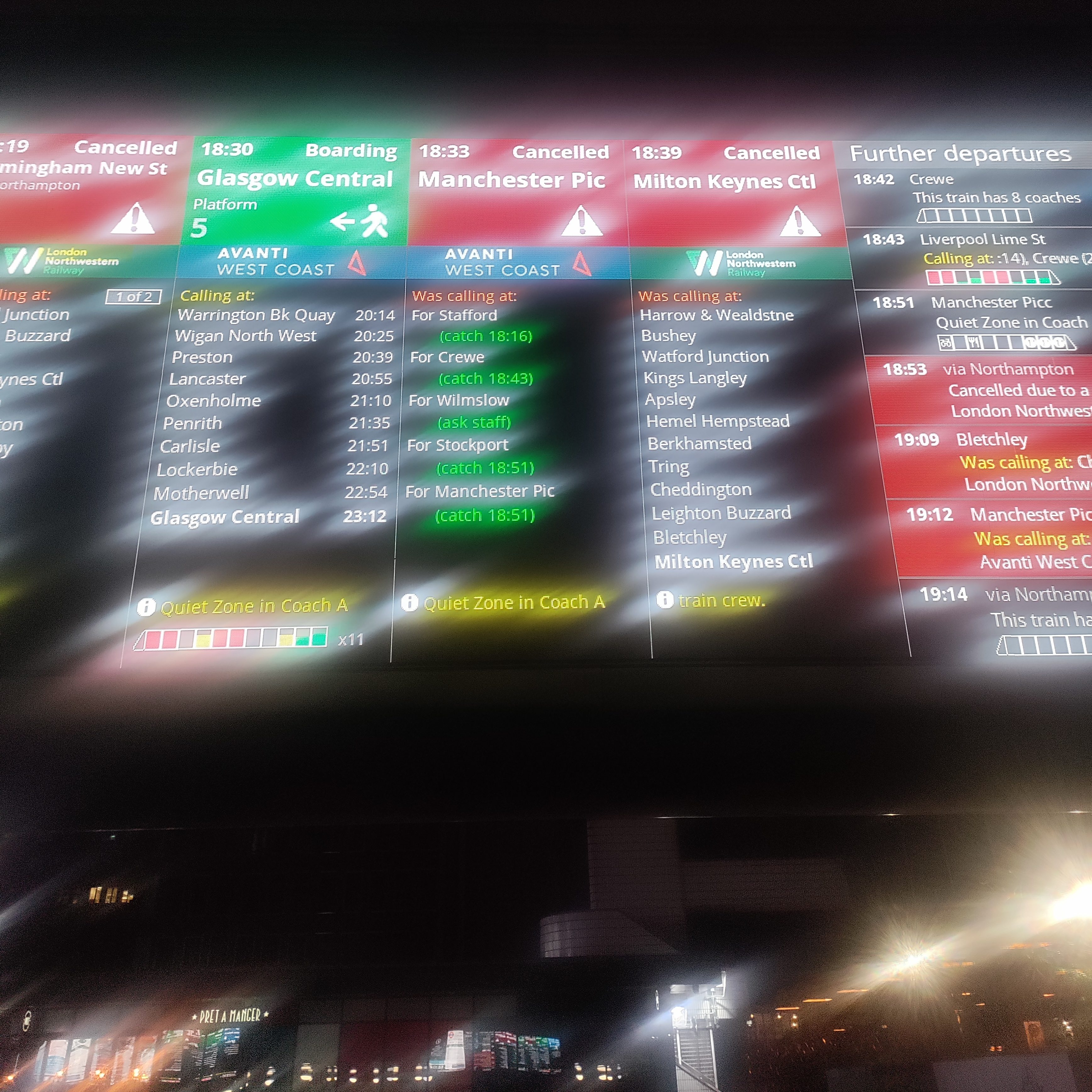 samas muidugi seda sõiduplaanijärgset kahte tundi rongiga ei ole ma elus kogenud… vist mitte kunagi. kui see olemas oleks, siis oleks see päris kiire sõit, sest vahemaa on 265 km. aga enamus ronge sõidab siiski natuke aeglasemalt (kaks ja veerand tundi või sinnakanti); alati ei ole sobival ajal otserongi ja tuleb kulutada lisaveerandtund ümberistumisele Crewe’s; ja last but not least, selle liini rongid lihtsalt alailma hilinevad või jäetakse üldse ära.